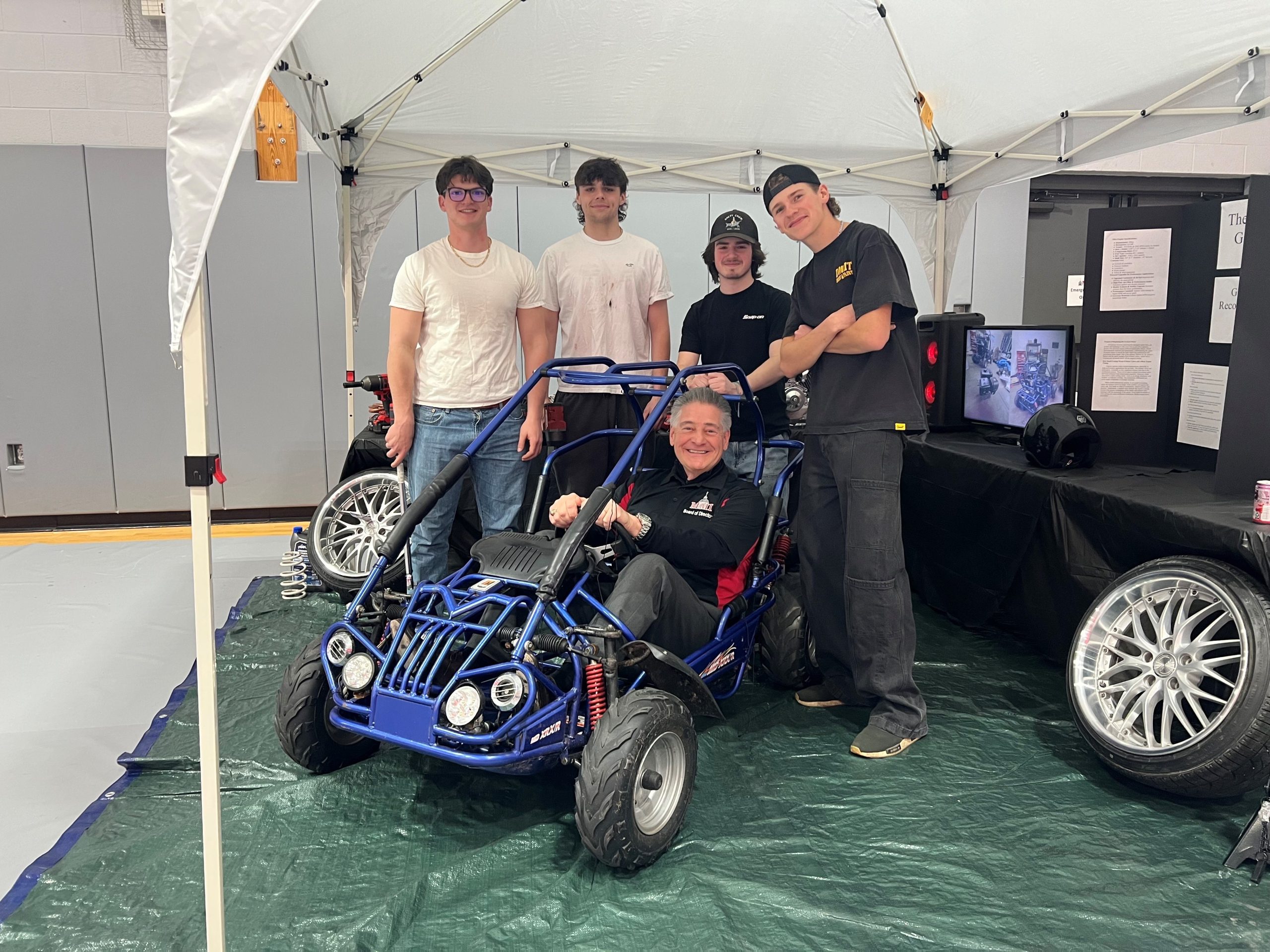 Hayden Schwabe, Lucas Pesotine, Dante DeStefano, and Josh Hoover stand behind their 2025 capstone project while MMI’s Board Chair Attorney Richard A. DiLiberto Jr ’79 tests out their vehicle.